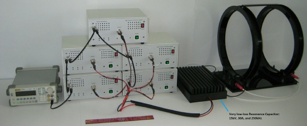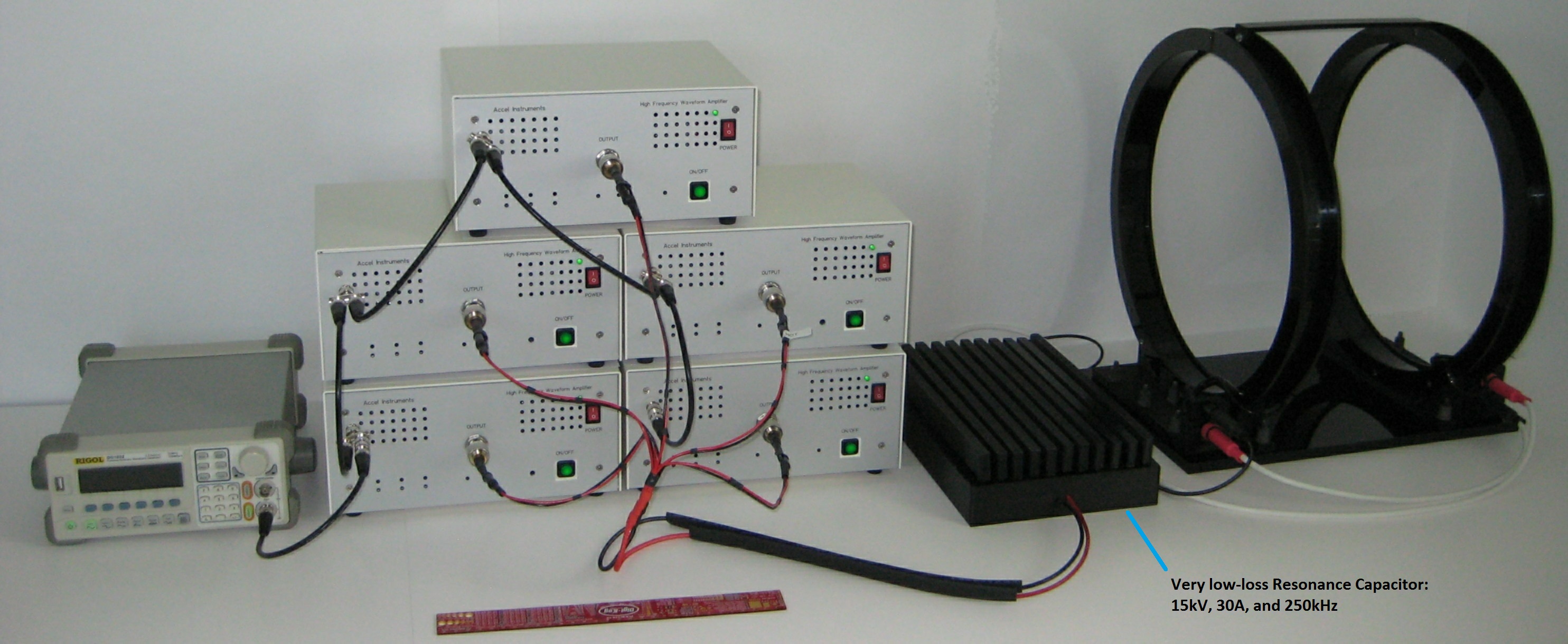 Figure 8 shows an example of an AC Helmholtz coil system using the series resonance method. From the left, a signal generator produces the sinewave. Five high-current drivers (left-center) connected in parallel to provide up +/-30A (60App) current. The driver’s output is connected to a custom-made very low loss, high-voltage, and high-frequency resonance capacitor (center-right). This resonance capacitor is designed for 15kV, 30A, and 250kHz. On the right is a custom-made 15-inch Helmholtz coil for generating magnetic field up to 1MHz.