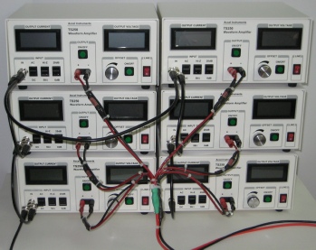 The Helmholtz coils may be driven directly using a current amplifier driver such as the T250 Waveform Amplifier. The direct-drive method is best suited for low inductance coils or low frequency or both. The coil's reactance (imaginary part of the impedance) is low enough that it can be driven by a high-current amplifier directly as shown in Figure 4 and Figure 5.